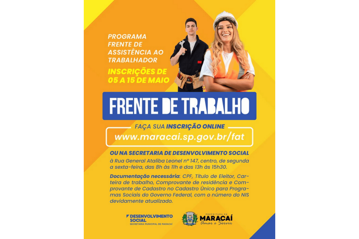 A Prefeitura de Maracaí abre, entre os dias 5 e 15 de maio de 2026, as inscrições para o Programa Frente de Assistência ao Trabalhador. A iniciativa é voltada a moradores que buscam uma oportunidade de renda e inserção no mercado, com foco em pessoas já cadastradas em programas sociais.