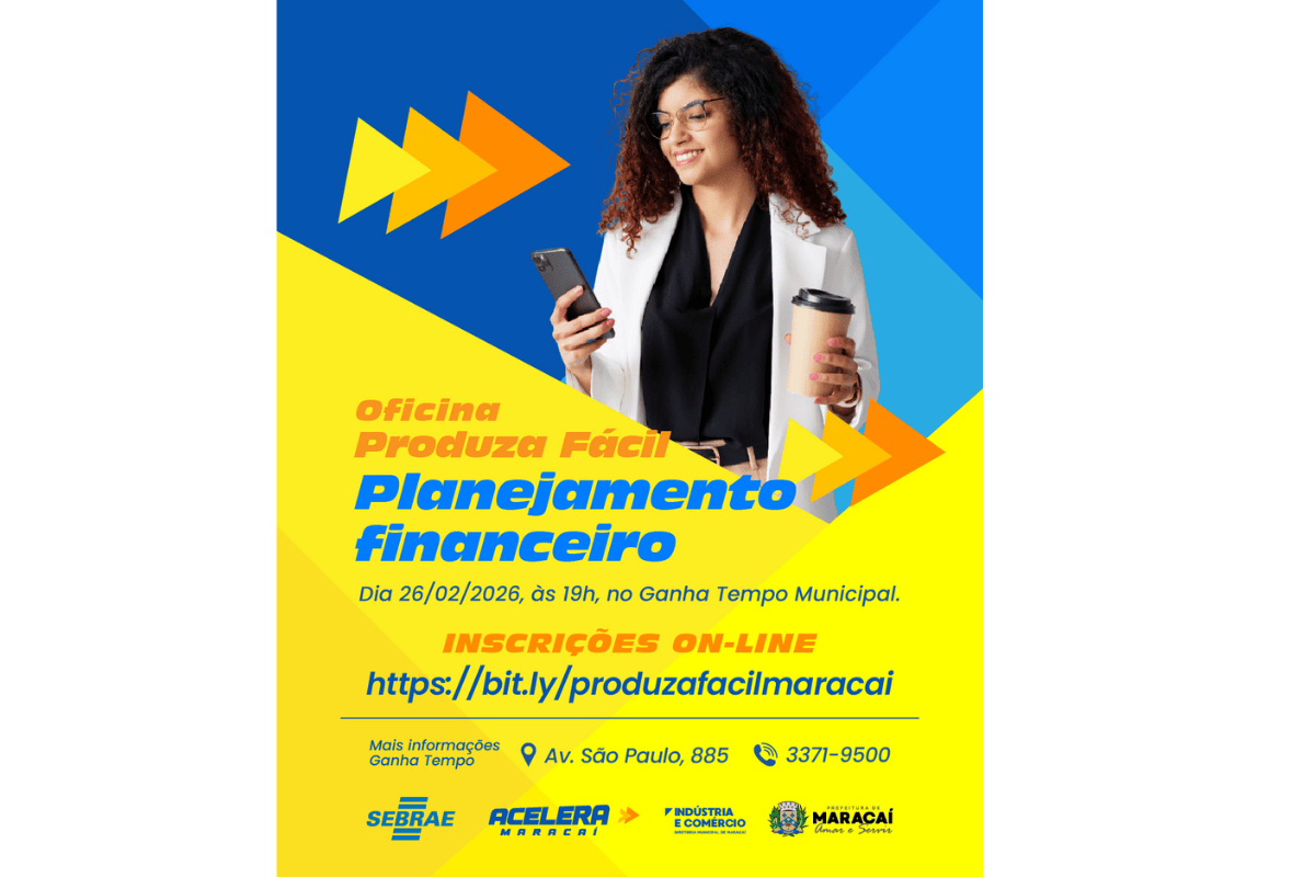 A Prefeitura de Maracaí realiza no dia 26 de fevereiro de 2026, às 19h, a Oficina Produza Fácil - Planejamento Financeiro, no Ganha Tempo Municipal. A atividade é gratuita e voltada a quem deseja organizar melhor as finanças pessoais e aprimorar a gestão do próprio negócio.