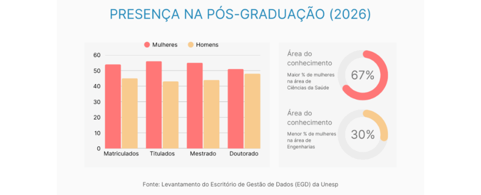 Atualmente, elas ocupam 52,8% das vagas nos cursos de graduação da universidade e 54,7% das vagas nos cursos de pós-graduação stricto sensu. As mulheres também são maioria entre os estudantes titulados em programas de mestrado e doutorado, indicando crescimento consistente da participação feminina na formação acadêmica e científica.