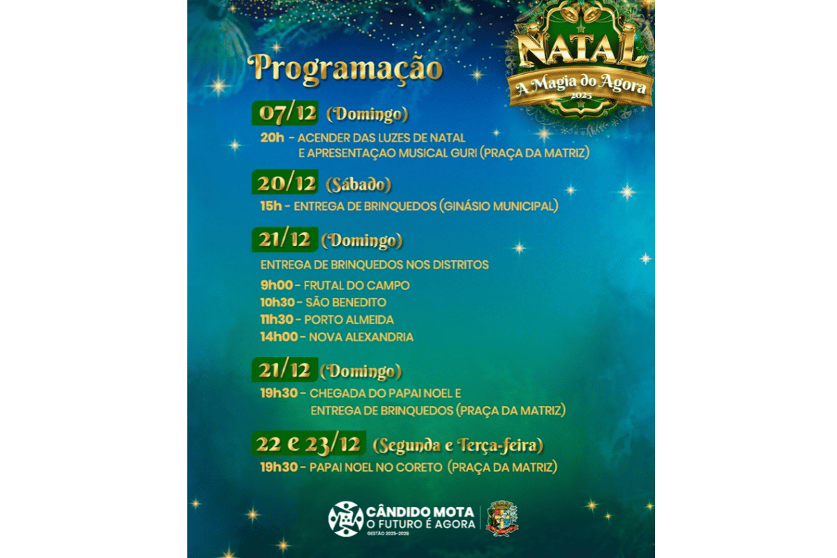 O Natal 2025 de Cândido Mota começa neste domingo, 7 de dezembro, com o acender das luzes natalinas e apresentação musical na Praça da Matriz. A programação oficial segue ao longo do mês com entregas de brinquedos, chegada do Papai Noel e atividades nos distritos e no centro da cidade.