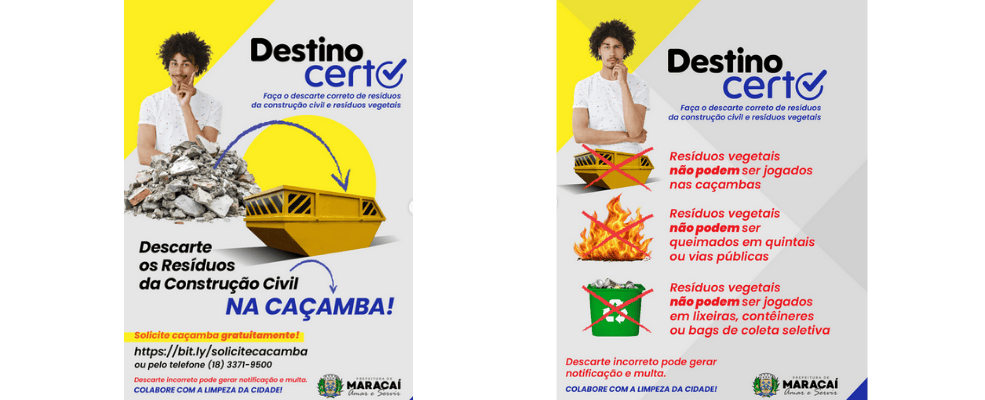 A campanha “Destino certo” chama atenção para dois tipos de materiais bastante comuns no dia a dia das cidades: os entulhos de obras e os resíduos orgânicos resultantes de podas e jardinagem. A proposta é esclarecer onde cada material deve ser descartado para evitar acúmulo irregular em calçadas, terrenos, vias públicas e sistemas de coleta inadequados.