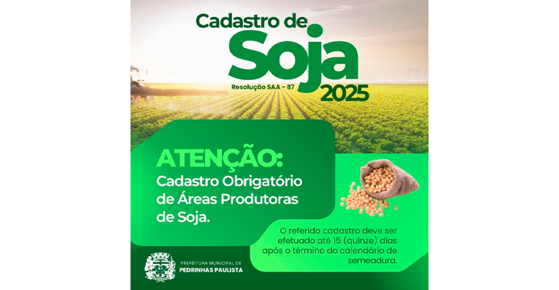 A Secretaria de Agricultura e Abastecimento do Estado de São Paulo, por meio da Coordenadoria de Defesa Agropecuária (CDA), informa que todos os produtores rurais de Pedrinhas Paulista que cultivarem soja na safra 2025/2026 devem realizar o Cadastro Obrigatório de Áreas Produtoras de Soja, conforme determina a Resolução SAA nº 87.