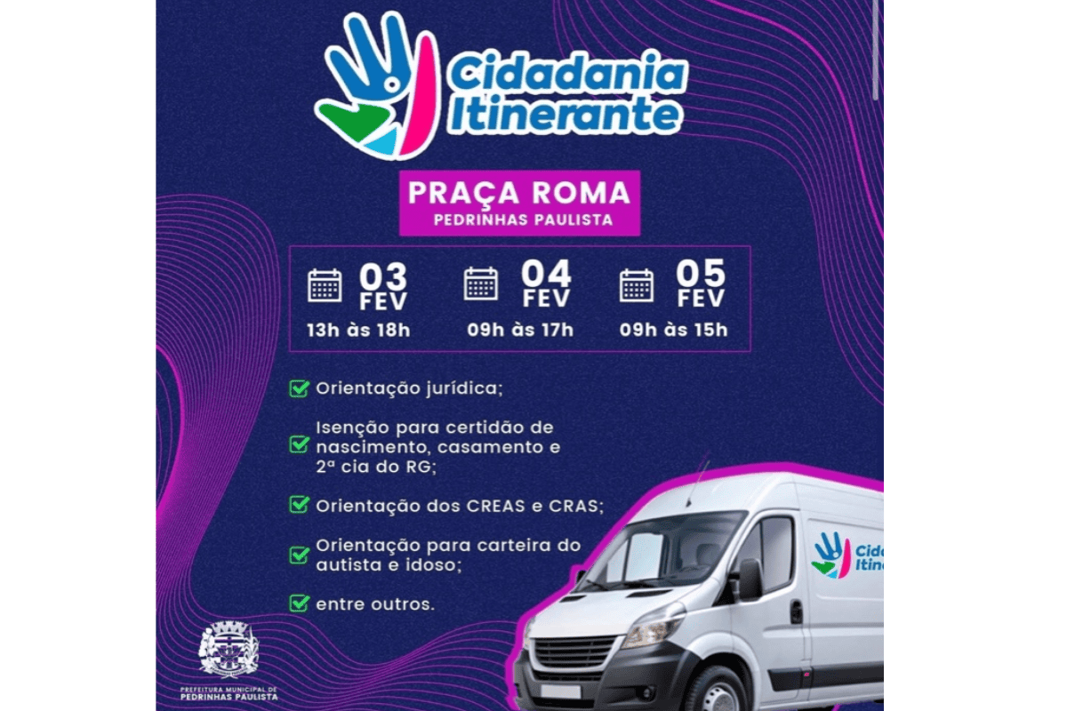 De acordo com a Prefeitura de Pedrinhas Paulista, o projeto disponibiliza uma van equipada para atendimentos descentralizados, com foco na regularização de documentos, orientações sociais e acesso a direitos básicos, aproximando o poder público dos moradores.
