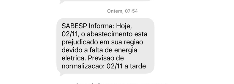 Na tarde de domingo, a Sabesp enviou uma mensagem de texto aos clientes informando que a interrupção seria temporária e que o fornecimento seria normalizado ao longo do período da tarde. A empresa justificou o problema afirmando que a causa era a falta de energia elétrica nos sistemas de bombeamento, colocando a responsabilidade sobre a concessionária Energisa.