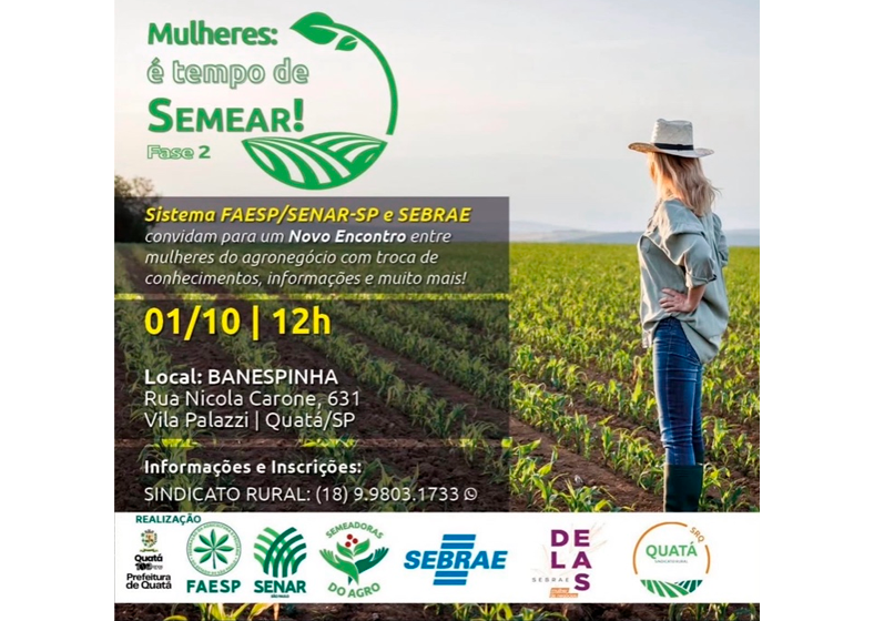 O município de Quatá será palco de um novo encontro do projeto “Mulheres: é tempo de semear”, iniciativa voltada para a valorização e fortalecimento da presença feminina no agronegócio. O evento está marcado para o dia 1º de outubro, às 12h, na Banespinha, localizada na Rua Nicola Carone, 631, Vila Palazzi.