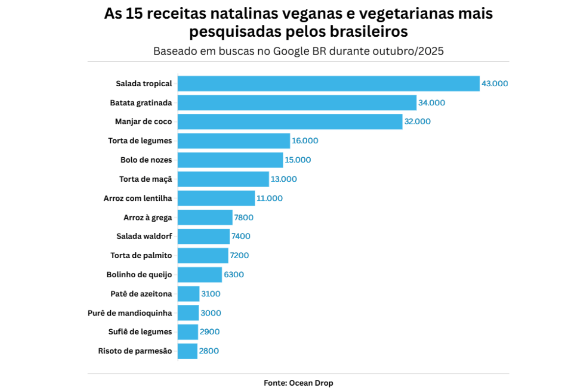 A ceia de Natal dos brasileiros está passando por mudanças, e isso aparece com clareza nas buscas online. Um levantamento da Ocean Drop, marca de suplementos naturais, mostra quais são as 15 receitas veganas e vegetarianas mais pesquisadas no Google Brasil no período que antecede o Natal, com base no volume de buscas registradas em outubro de 2025.