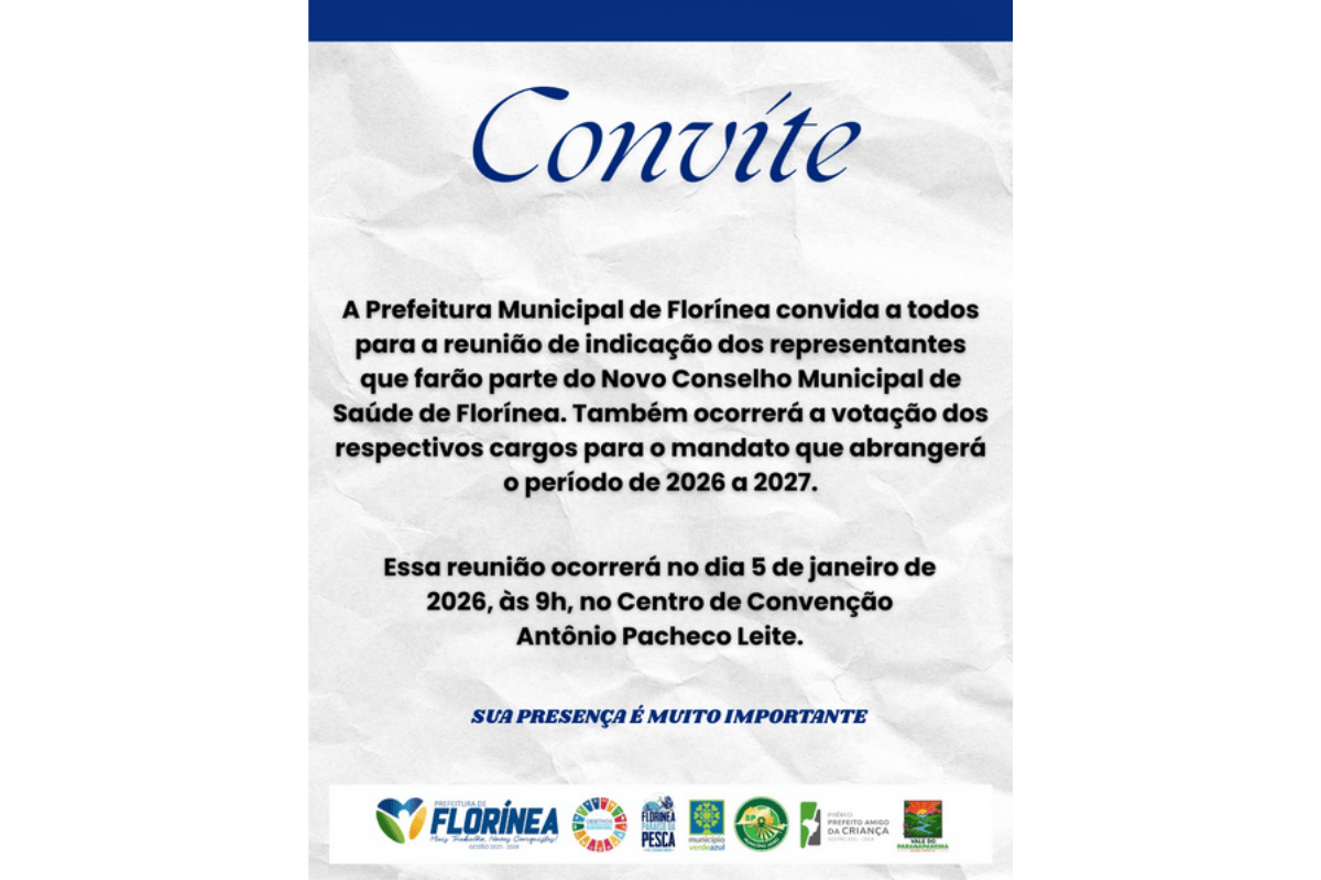 A Prefeitura Municipal de Florínea realizará no dia 5 de janeiro de 2026, às 9h, a reunião pública para indicação dos representantes que irão compor o novo Conselho Municipal de Saúde de Florínea, além da votação dos cargos para o mandato que abrange o período de 2026 a 2027. O encontro acontecerá no Centro de Convenção Antônio Pacheco Leite e é aberto à participação da comunidade.