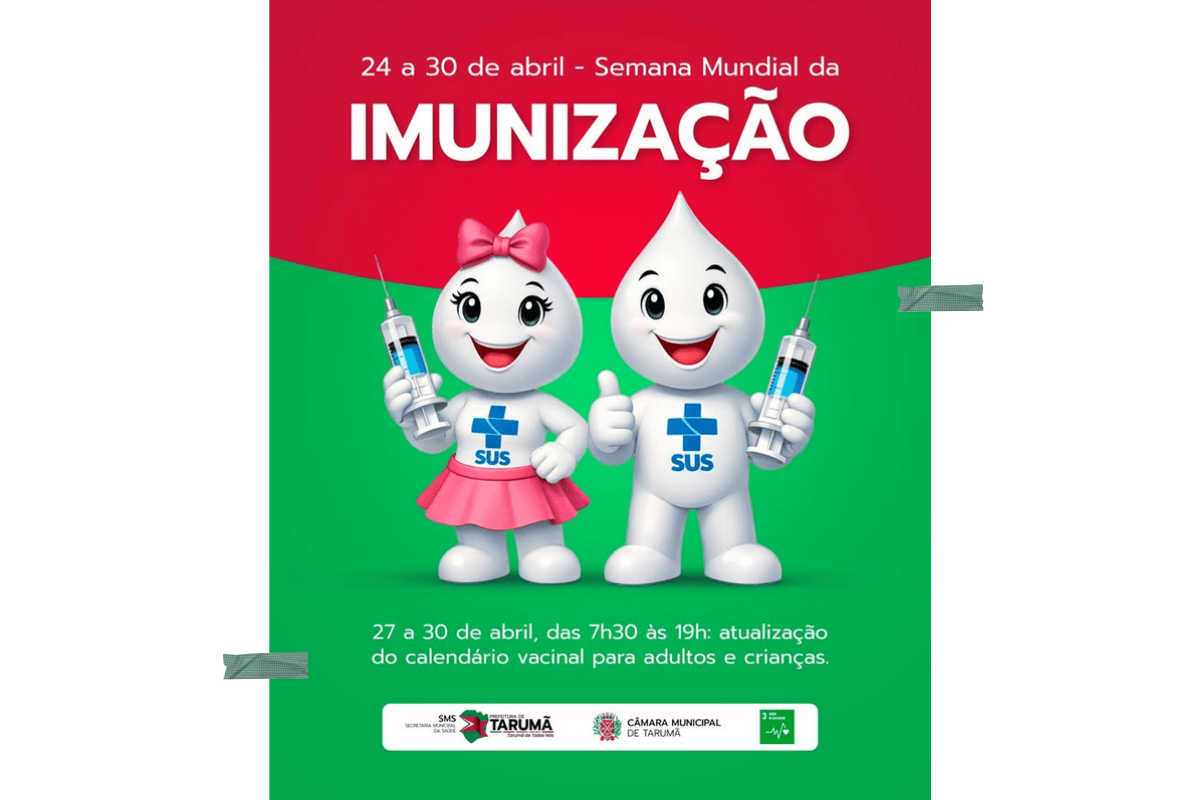 A Prefeitura de Tarumã realiza, entre os dias 27 e 30 de abril, uma ação especial de vacinação voltada à atualização do calendário vacinal da população. A iniciativa integra a Semana Mundial da Imunização e busca ampliar a cobertura de vacinas no município.