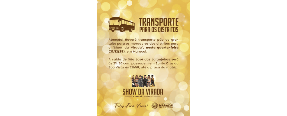 Os moradores dos distritos de Maracaí contarão com transporte público gratuito para participar do Show da Virada 2025/2026, que acontece hoje, quarta-feira, 31 de dezembro, na região central do município. A medida foi anunciada pela Prefeitura de Maracaí para garantir acesso, segurança e mobilidade durante a celebração do Ano Novo.