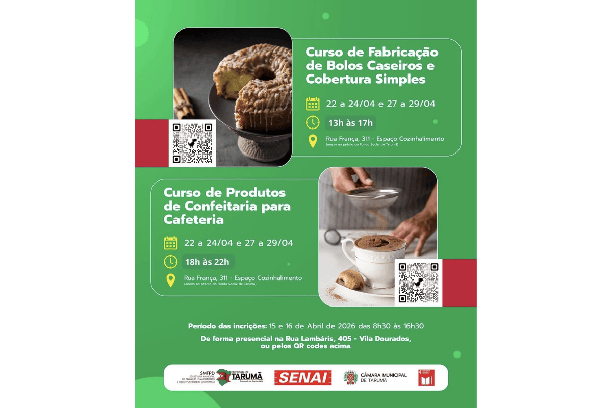 A Prefeitura de Tarumã abriu, nesta quarta-feira (15), as inscrições para dois cursos gratuitos na área de confeitaria, voltados à qualificação profissional e geração de renda. Os interessados têm até quinta-feira (16) para se inscrever.