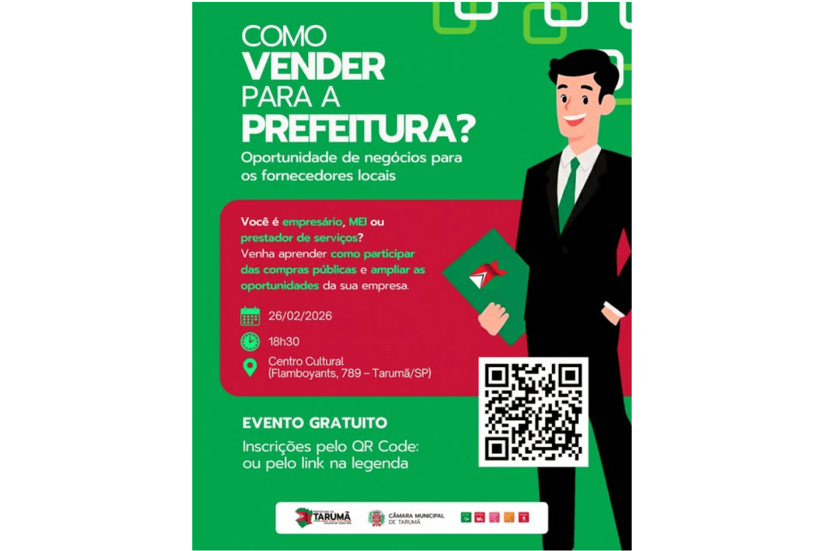 A Prefeitura de Tarumã realiza no dia 26 de fevereiro de 2026, às 18h30, um encontro voltado a empresários, microempreendedores individuais e prestadores de serviços interessados em vender para o poder público municipal. O evento acontece no Centro Cultural Celso Rodrigues dos Santos, conhecido como Celso Carneiro, e é gratuito.