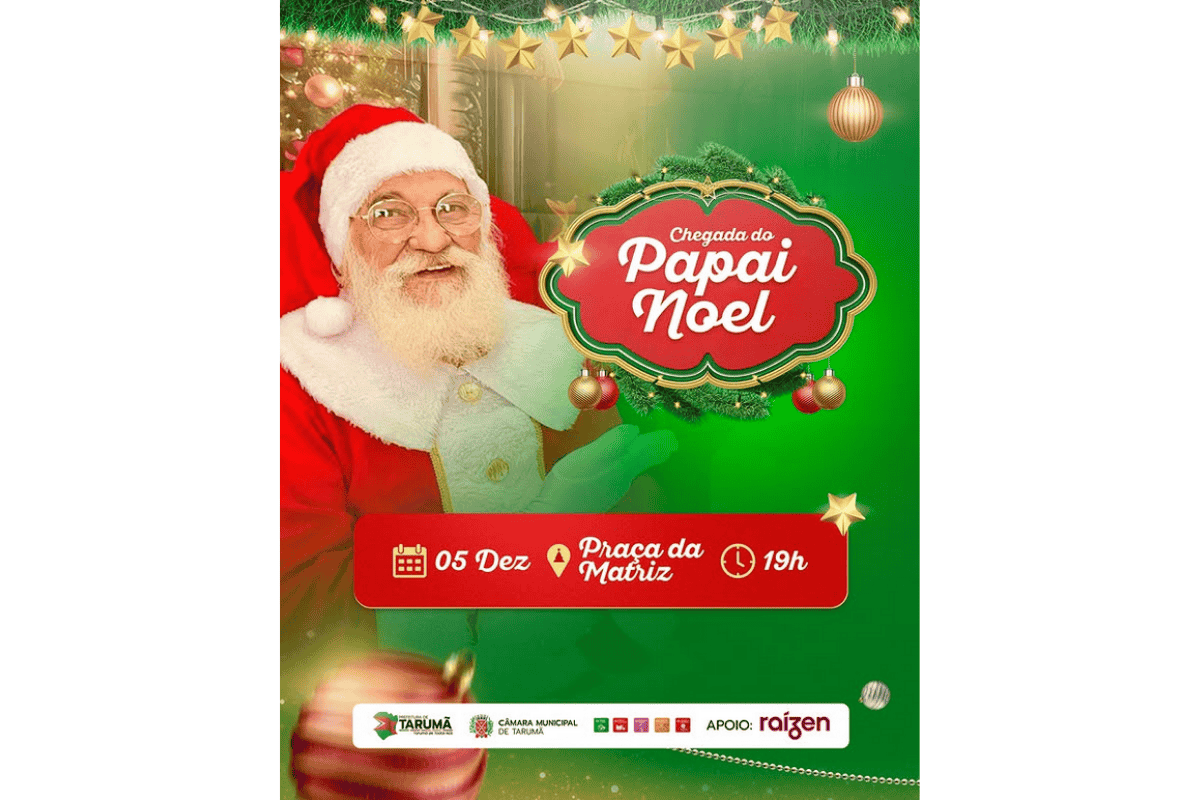 A magia do Natal toma conta de Tarumã nesta sexta-feira, 5 de dezembro, na Praça da Matriz, onde acontece a chegada oficial do Papai Noel e o tradicional acendimento das luzes natalinas. A programação tem início às 19h e é aberta a toda a população, com atividades especiais para as famílias.