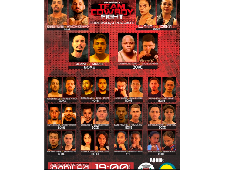 Paraguaçu Paulista se prepara para sediar, no dia 13 de dezembro, o primeiro Team Cowboy Fight, um grande evento esportivo que promete movimentar o público e reunir atletas de várias modalidades de luta. A programação começa às 19h, no Ginásio de Esportes Padilha, com 16 combates entre competidores do boxe, K1, MMA e submission.