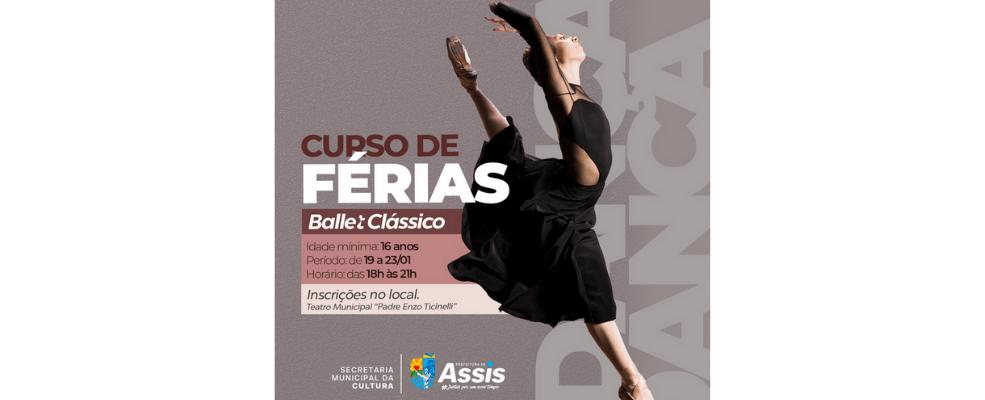 A Prefeitura de Assis, por meio da Secretaria Municipal de Cultura, está com inscrições abertas para o Curso de Férias de Ballet Clássico, voltado a pessoas com idade mínima de 16 anos que desejam aprimorar técnica, expressão corporal e movimento durante o período de recesso.