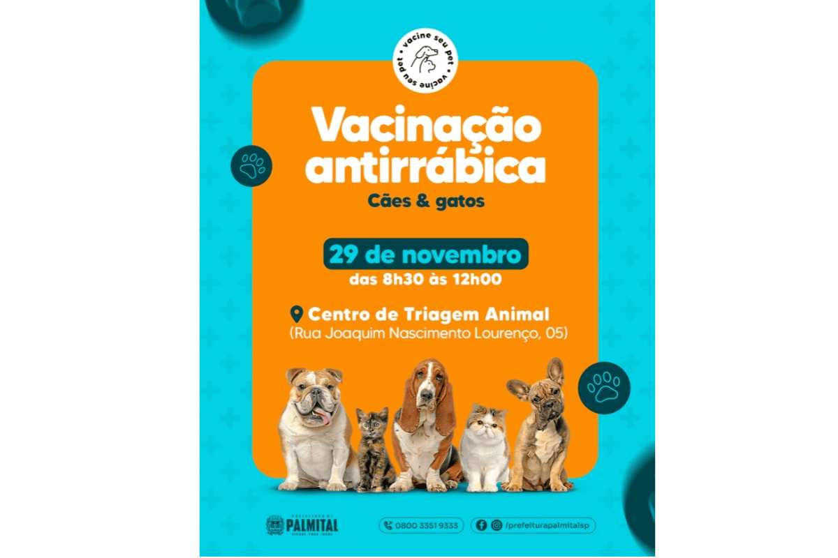 A Prefeitura de Palmital promove na manhã deste sábado, 29 de novembro, uma nova etapa de vacinação antirrábica para cães e gatos no Centro de Triagem Animal, localizado na Rua Joaquim Nascimento Lourenço, 05. A aplicação será realizada das 8h30 às 12h, com atendimento gratuito para a população.